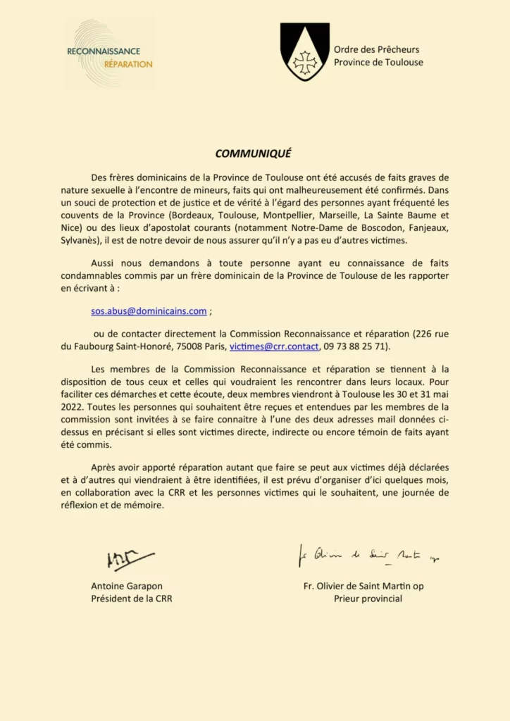 Le communiqué ci-contre est une suite logique au rapport de la Commission Indépendant sur les Abus Sexuels dans l’Eglise. Aujourd’hui, vient le moment de la réparation. Mais cela ne peut se limiter aux faits aujourd’hui connus sur la période qui couvre les 70 dernières années…