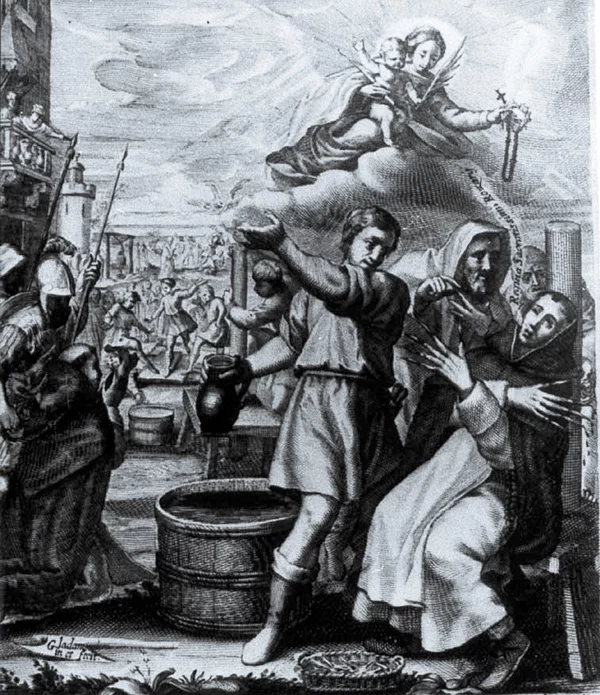 Nombreuses sont les églises anciennes qui avaient, grâce à une confrérie du rosaire, une image de la vierge accompagnée de saint Dominique et de sainte Catherine de Sienne, grandes figures de l’ordre des Prêcheurs qui travaille beaucoup à la diffusion de cette forme de prière.